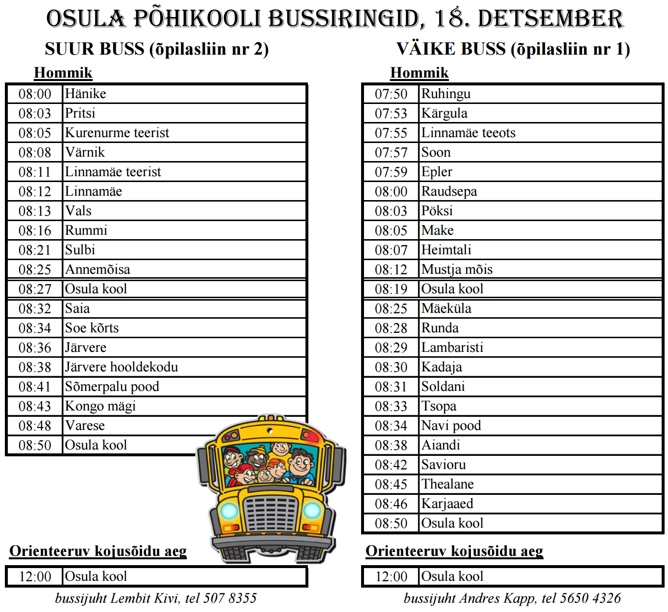 Osula kooli jõulupidu Loomise kuupäev 12.12.2025 Autor Osula PK Koolibusside sõidugraafikud 17. detsembri hommikul ja lõuna ajal Loomise kuupäev 12.12.2025 Autor Osula PK Koolibusside sõidugraafikud 17. detsembri õhtul Loomise kuupäev 12.12.2025 Autor Osula PK Osula kooli jõululaat Loomise kuupäev 05.12.2025 Autor Osula PK Vaata rohkem