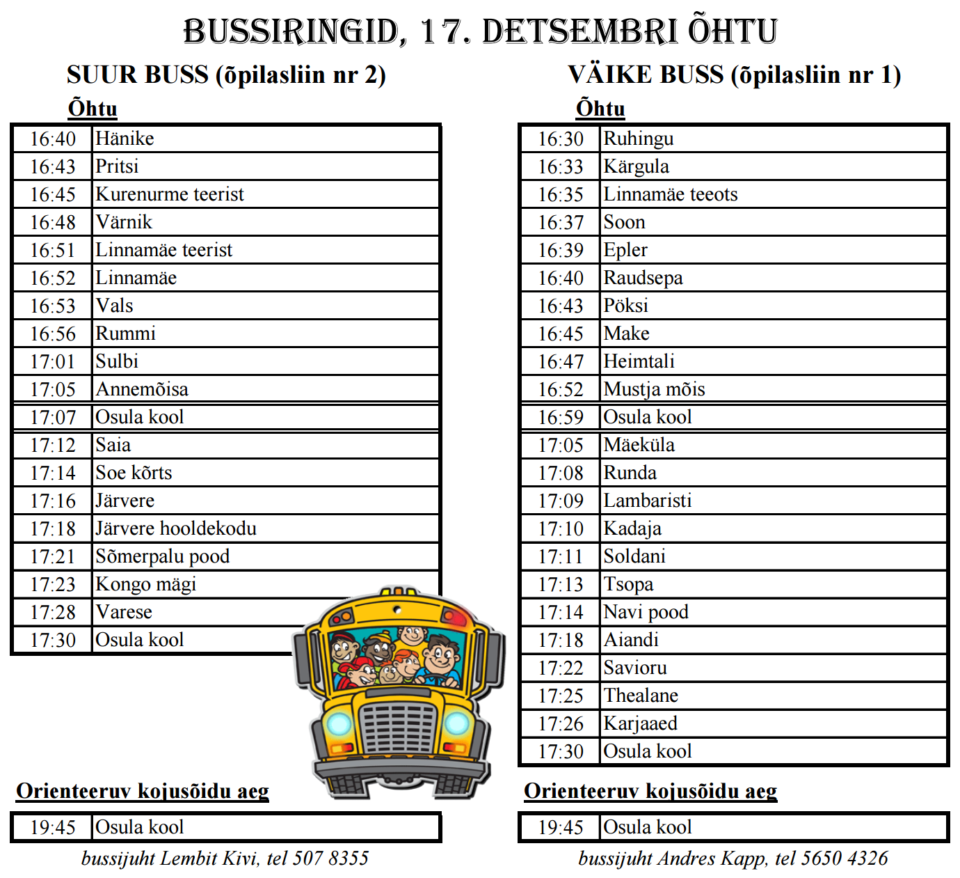 Osula kooli jõulupidu Loomise kuupäev 12.12.2025 Autor Osula PK Koolibusside sõidugraafikud 17. detsembri hommikul ja lõuna ajal Loomise kuupäev 12.12.2025 Autor Osula PK Koolibusside sõidugraafikud 18. detsembril Loomise kuupäev 12.12.2025 Autor Osula PK Osula kooli jõululaat Loomise kuupäev 05.12.2025 Autor Osula PK Vaata rohkem